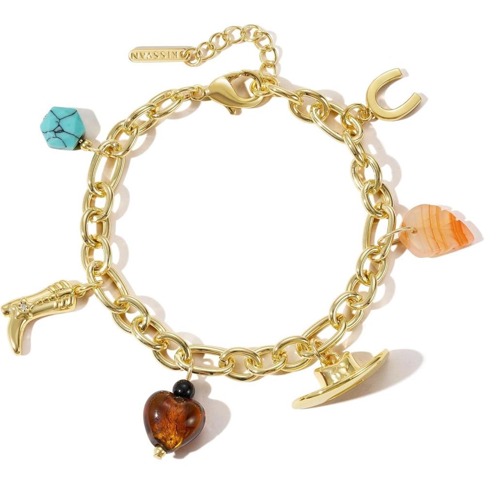 KissYan Cowgirl Western Charm Bracelets, 14K Gold Plated Boot Horseshoe Turquoise Pendant Chain Vintage Jewelry Gift for Women