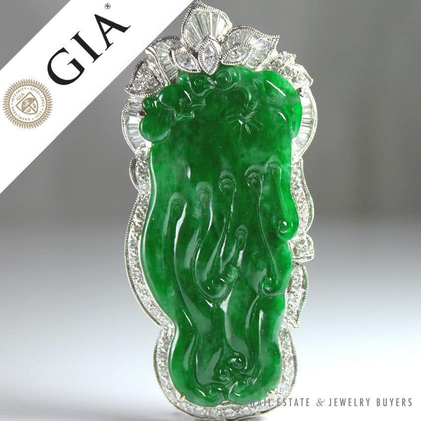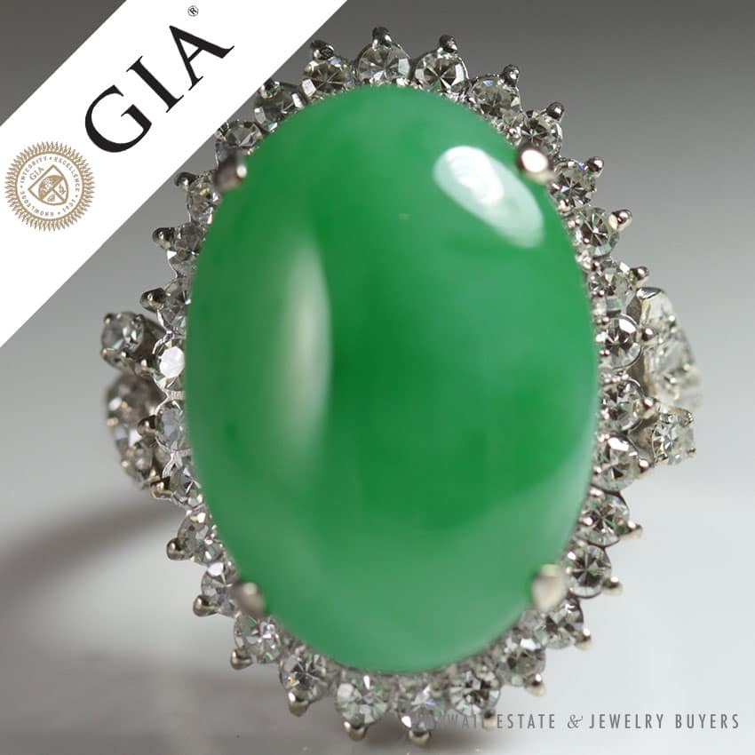 GIA Certified Large Apple Green Jade Diamond 14K White Gold Ring