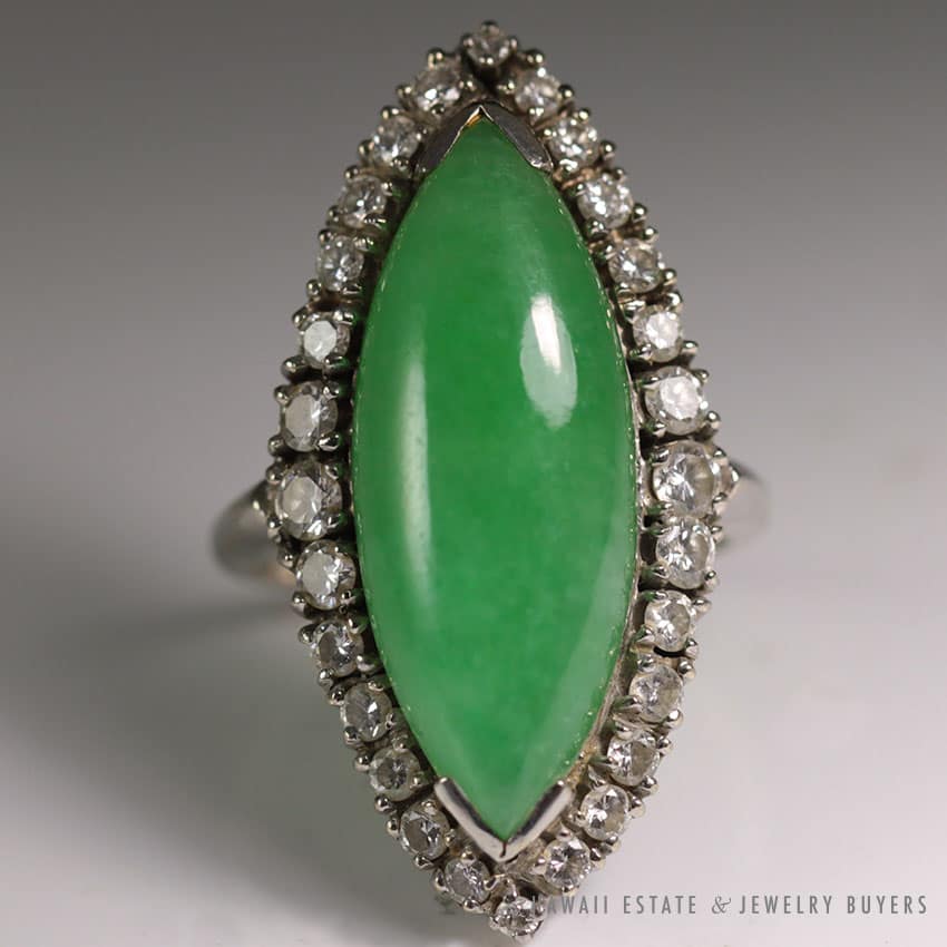 Vintage 1970’s Large Marquise Apple Green Jade Diamond 14K Ring
