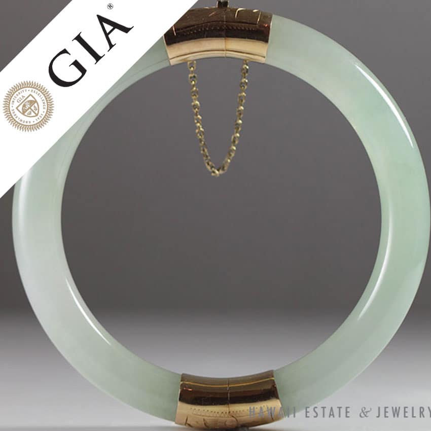 GIA Certified Pale Green Jade 14K Yellow Gold Hinged Bangle
