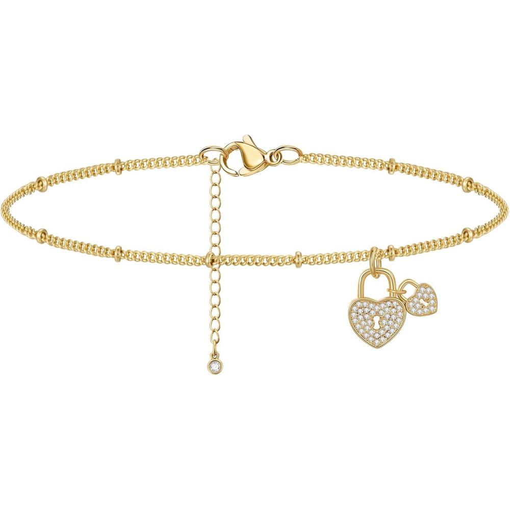 KissYan Gold Ankle Bracelet for Women, Dainty 14k Gold Plated Cuban Link Foot Chain Adjustable Paperclip Beaded Beach Anklet Minimalist Cute Foot Jewelry Tiny Gifts(Satellite Heart)