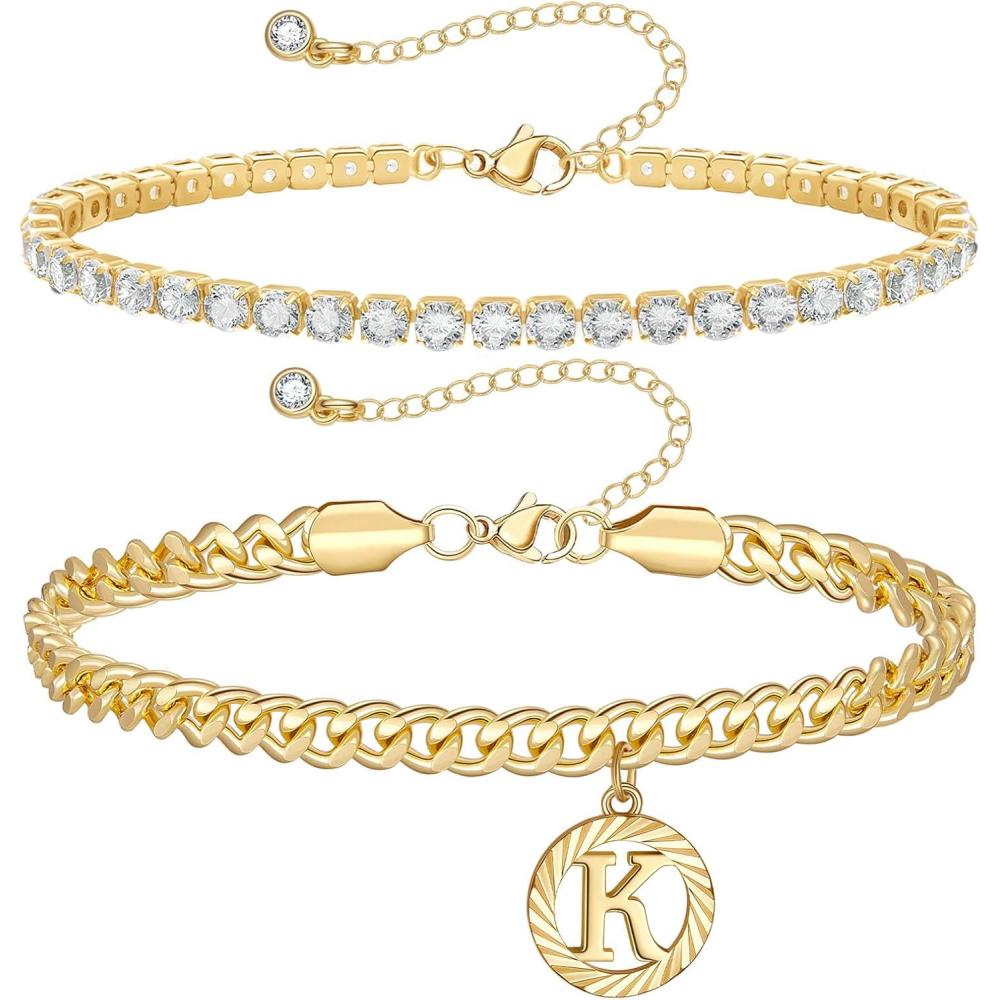 KissYan Gold Ankle Bracelets for Women, 14K Layered Dainty Initial Anklets Set Adjustable Layering Letter Cuban Link Cubic Zirconia Tennis Chain Ankles Summer Beach Foot Jewelry Gifts
