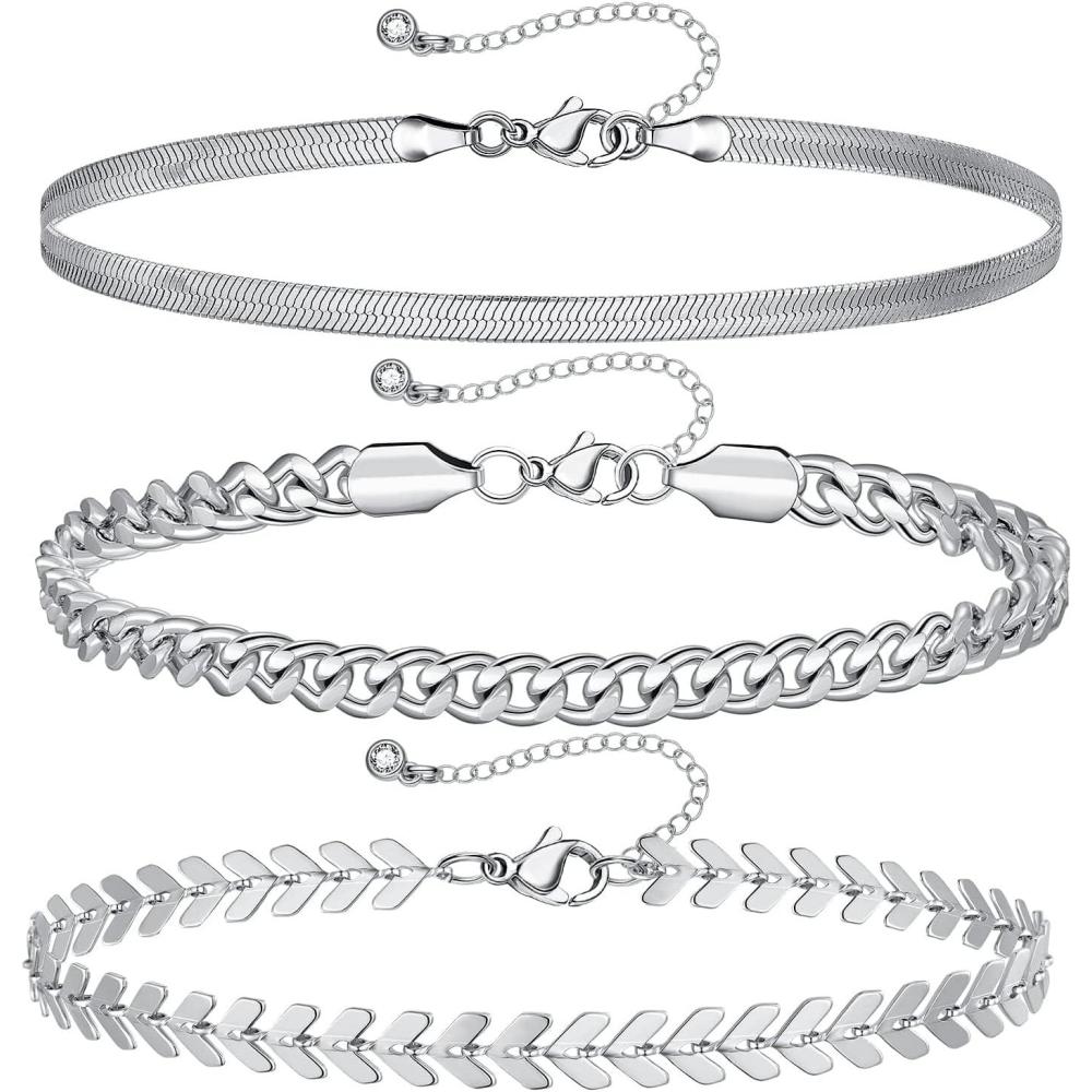 KissYan Gold Layered Ankle Bracelets for Women, Dainty 14k Gold Plated Layering Anklets Set Adjustable Fashion Cuban Link Snake Tennis Chain Ankles Summer Beach Foot Jewelry(E-Silver)