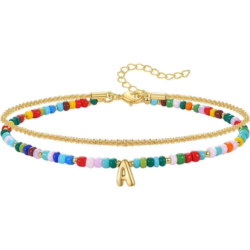 KissYan Initial Ankle Bracelets for Women, Layered Colorful Beaded Anklet with 14K Gold Chain Waterproof Dainty Jewelry Gift(A Letter)