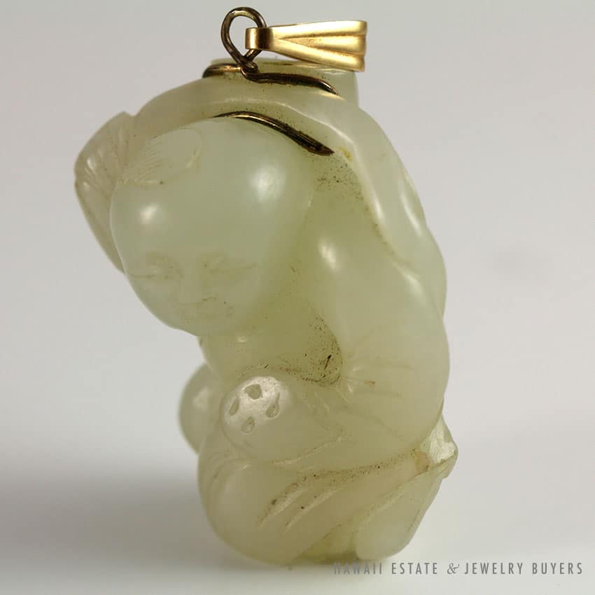 49.1g 14KYG PALE GREEN, RED, AND LAVENDER CARVED JADE PENDANT MEASURES 57x39mm
